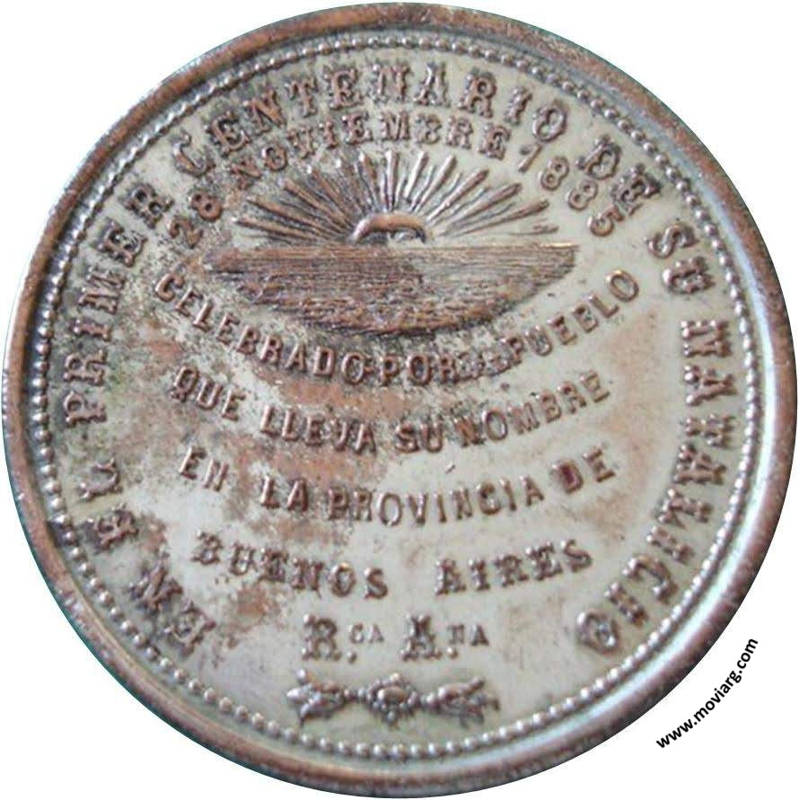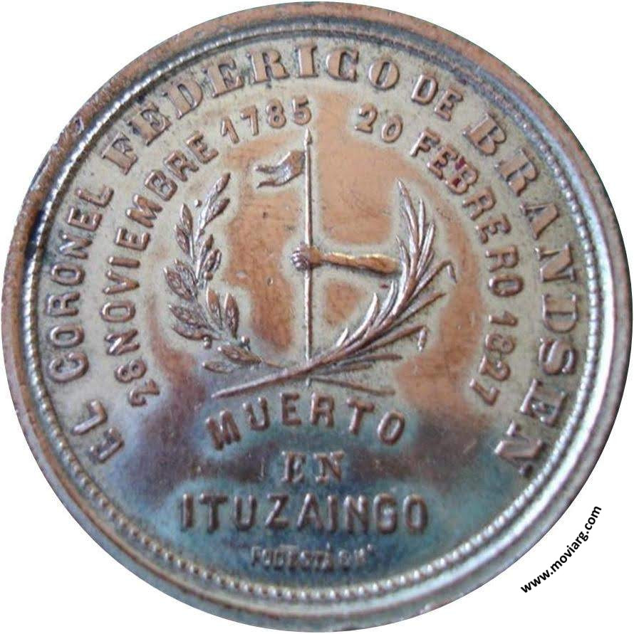 Anverso: EL CORONEL FEDERICO DE BRANDSEN / 28 NOVIEMBRE 1785 / 20 FEBRERO 1827 / MUERTO / EN / ITUZAINGO. Firma: PODESTÁ & HO. Reverso: EN EL PRIMER CENTENARIO DE SU NATALICIO / 28 NOVIEMBRE 1885 / CELEBRADO POR EL PUEBLO / QUE LLEVA SU NOMBRE / EN LA PROVINCIA DE / BUENOS AIRES / RCA. ANA. Referencia: ROSA-270 | |