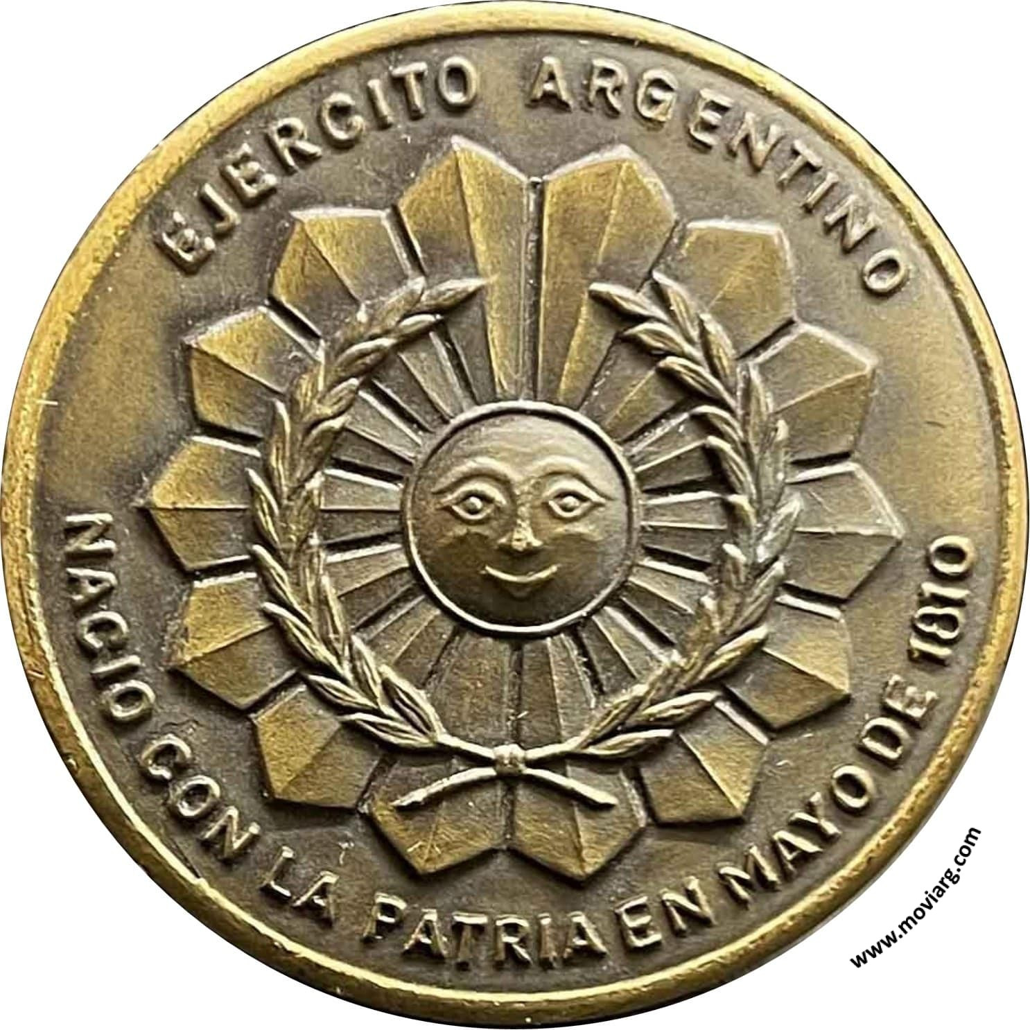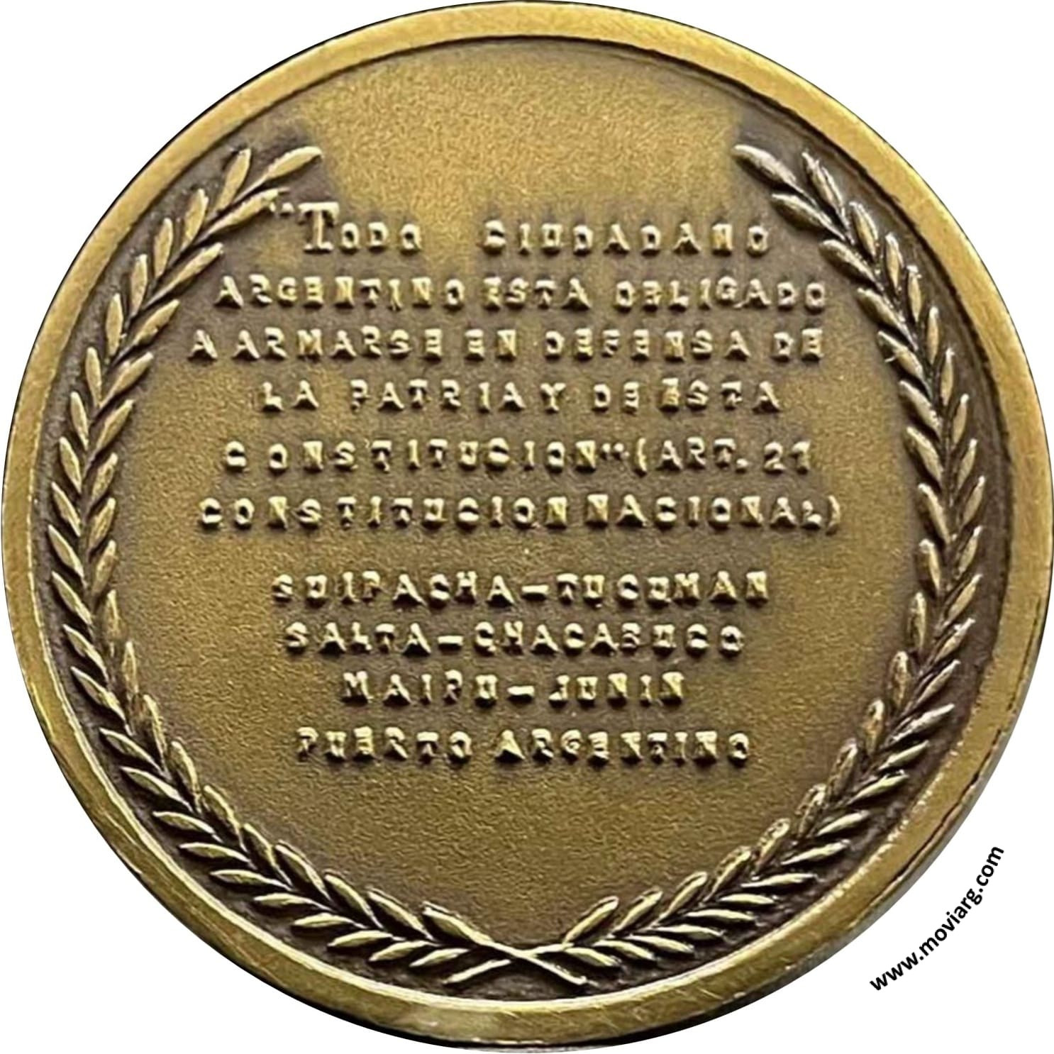 Anverso: EJERCITO ARGENTINO / NACIO CON LA PATRIA EN MAYO DE 1810 Reverso: " TODO CIUDADANO / ARGENTINO ESTA OBLIGADO / A ARMARSE EN DEFENSA DE / LA PATRIA Y DE ESTA / CONSTITUCION " ( ART. 21 / CONSTITUCION NACIONAL ) / SUIPACHA - TUCUMAN / SALTA - CHACABUCO / MAIPU - JUNIN / PUERTO ARGENTINO Referencia: | |