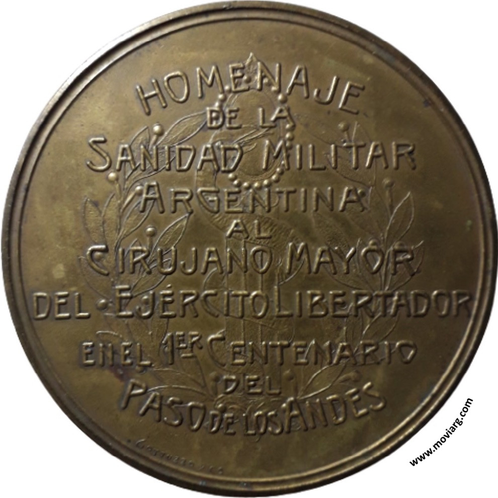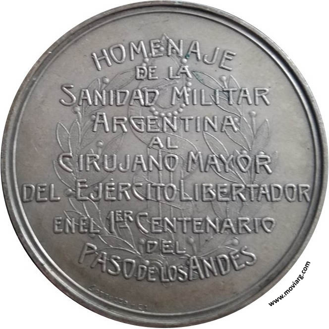 Anverso: DR. DIEGO PAROISSIEN / 1817-1917. Firma: ROSCHIAN / 1916 Reverso: HOMENAJE / DE LA / SANIDAD MILITAR / ARGENTINA / AL / CIRUJANO MAYOR / DEL EJÉRCITO LIBERTADOR / EN EL 1ER. CENTENARIO / DEL / PASO DE LOS ANDES. Firma: GOTTUZZO Y CA. Referencia: | |
