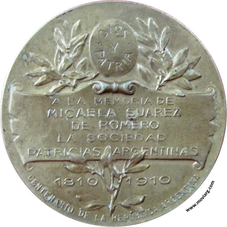 Anverso: 1774 / 1930. Firma: C. Y AF. ROSSI Reverso: DIOS / Y / PATRIA / Á LA MEMORIA DE / MICAELA SUAREZ / DE ROMERO / LA SOCIEDAD / PATRICIAS ARGENTINAS / 1810 1910 / CENTENARIO DE LA REPÚBLICA ARGENTINA Referencia: | |