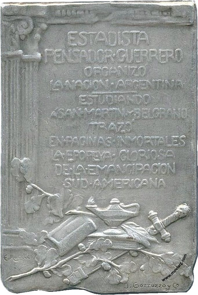 rosfil1 Anverso: BARTOLOMÉ / MITRE / 1821 - 1906Reverso: ESTADISTA / PENSADOR GUERRERO / ORGANIZÓ / LA NACION ARGENTINA / ESTUDIANDO / A SAN MARTIN Y BELGRANO / TRAZÓ / EN PAGINAS INMORTALES / LA EPOPEYA GLORIOSA / DE LA EMANCIPACION / SUD AMERICANA. Firma: J. GOTTUZZO Y CA. / E. MUELLER Referencia: | |