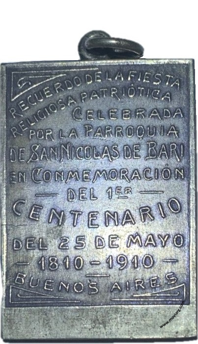 Colección Magnin Anverso: APOSTOLADO DE LA ORACION / BENDICIÓN DE LA IMAGEN DEL S. CORAZON / DE JESUS = MAYO 27 DE 1910Reverso: RECUERDO DE LA FIESTA / RELIGIOSA PATRIÓTICA / CELEBRADA / POR LA PARROQUIA / DE SAN NICOLAS DE BARI / EN CONMEMORACIÓN / DEL 1ER. / CENTENARIO / DEL 25 DE MAYO / 1810 - 1910 / BUENOS AIRES Referencia: | |