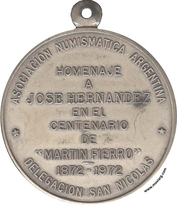 Pieza híbrida - dos fuentes Anverso: [ JOSE HERNANDEZ / 1834 - 1886 ]Reverso: ASOCIACION NUMISMATICA ARGENTINA / HOMENAJE / A / JOSE HERNANDEZ / EN EL / CENTENARIO / DE / " MARTIN FIERRO " / 1872 - 1972 / DELEGACION SAN NICOLAS Referencia: | |