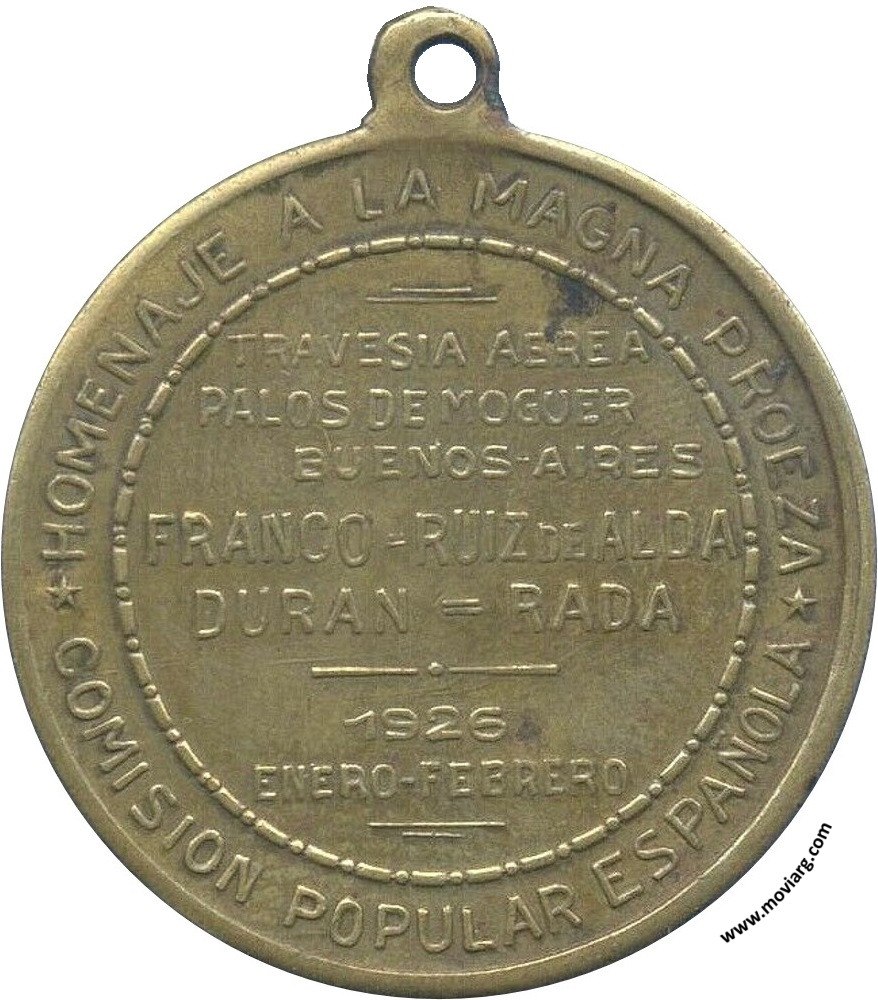 Anverso: 1492 · PLUS ULTRA · 1926. Firma: HORTA (?) Reverso: HOMENAJE A LA MAGNA PROEZA / COMISION POPULAR ESPAÑOLA / TRAVESIA AEREA / PALOS DE MOGUER / BUENOS - AIRES / FRANCO - RUIZ DE ALDA / DURAN = RADA / 1926 / ENERO - FEBRERO Canto: Humberto Burzio: "Buenos Aires en la medalla" 1981 p300. Referencia: BURZIO-889 | |