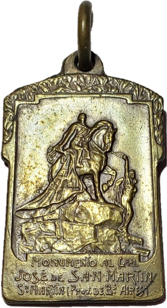 Anverso: MONUMENTO AL GRAL. / JOSÉ DE SAN MARTIN / SN. MARTIN (PROV. DE BS. AIRES). Firma: PASTORINO Y SALA Reverso: INAUGURADO EL 11 ABRIL DE 1915 / PRESIDENTE DE LA REPÚBLICA / DR. DN. VICTORINO DE LA PLAZA / GOBERNADOR DE LA PROVINCIA / DR. DN. MARCELINO UGARTE / INTENDENTE MUNICIPAL / DR. DN. DIEGO E. THOMPSON Referencia: | |