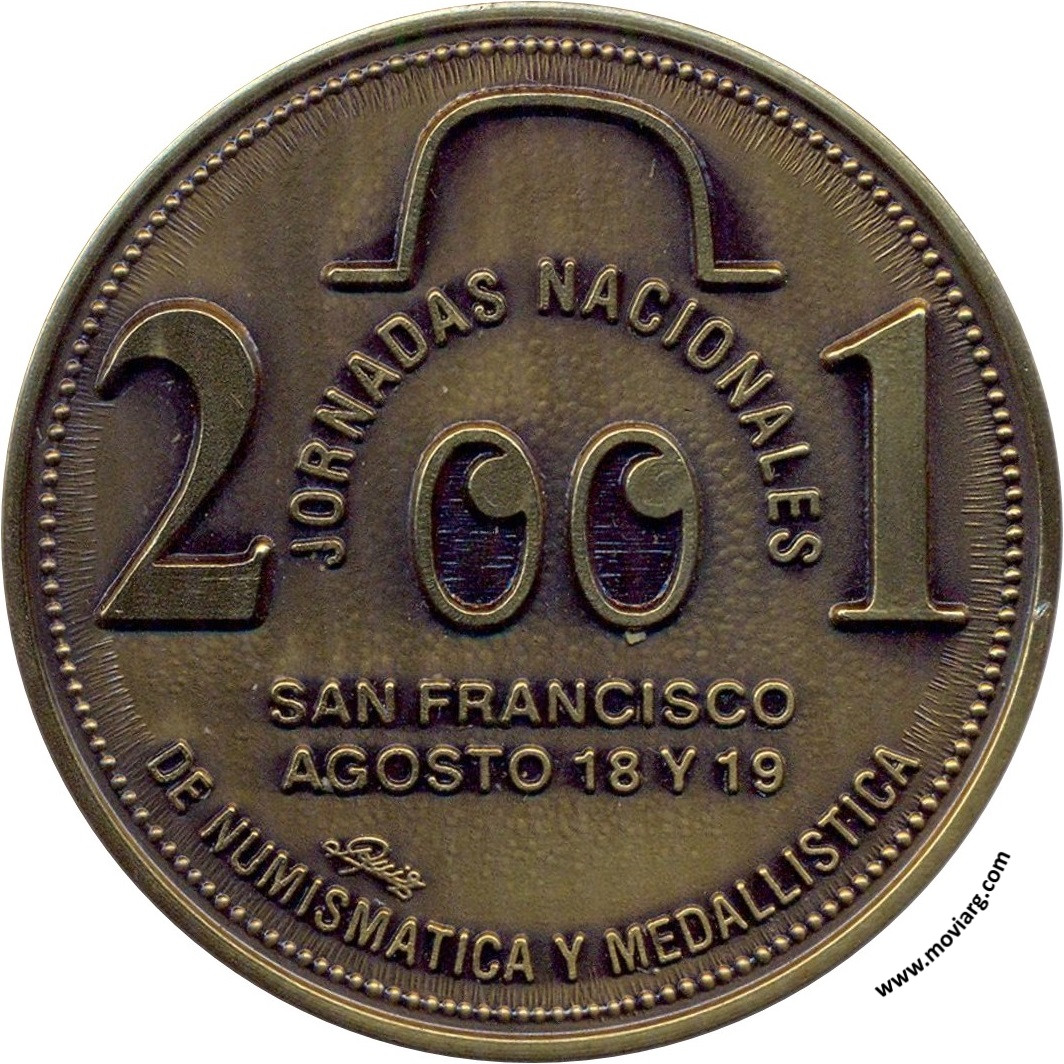 Anverso: JORNADAS NACIONALES / DE NUMISMATICA Y MEDALLISTICA / 2001 / SAN FRANCISCO / AGOSTO 18 Y 19. Firma: RUIZ Reverso: MUNICIPALIDAD DE SAN FRANCISCO / CORDOBA - 2001. Campo: CIUDAD DE SAN FRANCISCO Referencia: | |