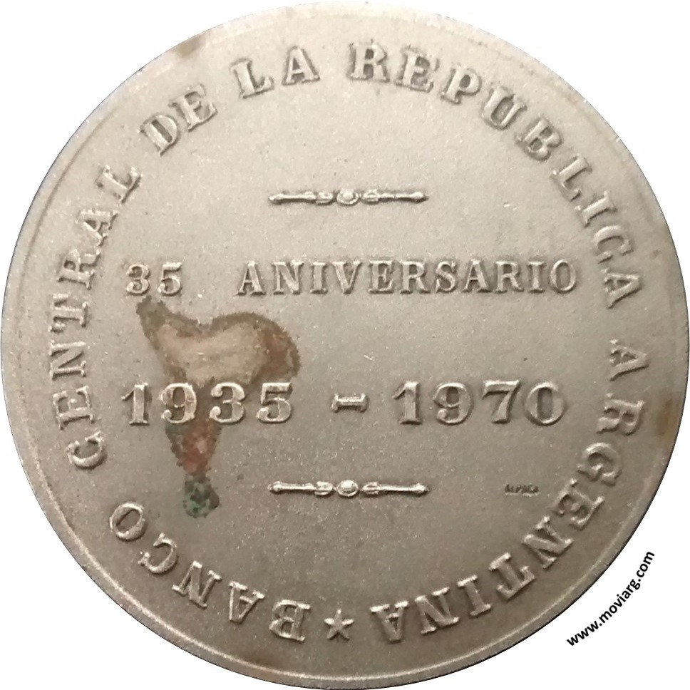 Anverso: B.C.R.A. Reverso: BANCO CENTRAL DE LA REPUBLICA ARGENTINA / 35 ANIVERSARIO / 1935 - 1970. Campo: [ ALPACA ] Referencia: | |