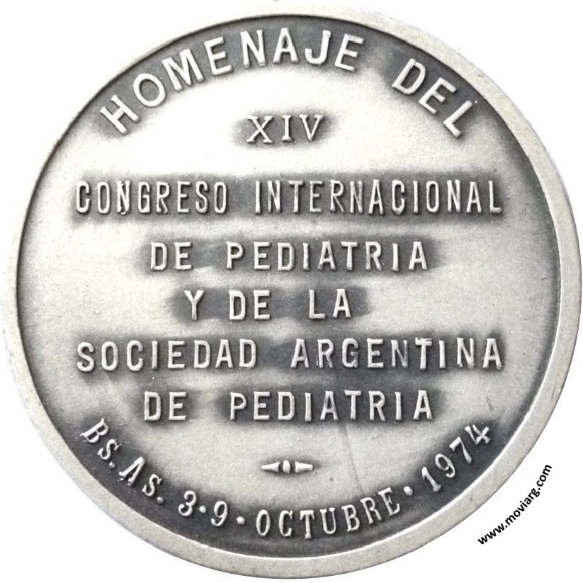 Anverso: POR UN NIÑO SANO / EN UN MUNDO MEJOR / PEDIATRIA XIV / B. AIRES 1974 Reverso: HOMENAJE DEL / XIV / CONGRESO INTERNACIONAL / DE PEDIATRIA / Y DE LA / SOCIEDAD ARGENTINA / DE PEDIATRIA / BS. AS. 3 · 9 · OCTUBRE · 1974 Referencia: | |
