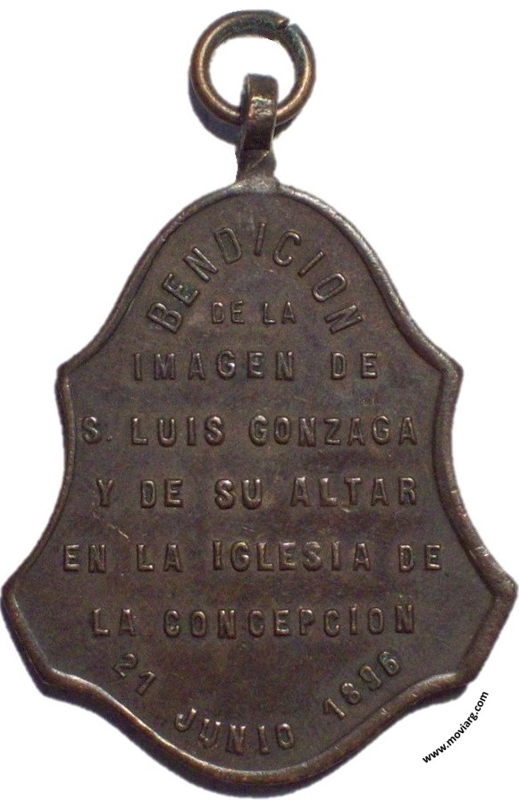 Anverso: SAN LUIS GONZAGA PATRONO DE LA JUVENTUD. Firma: ORZALI B. Y C. Reverso: BENDICION / DE LA / IMAGEN DE / S. LUIS GONZAGA / Y DE SU ALTAR / EN LA IGLESIA DE / LA CONCEPCION / 21 JUNIO 1896 Referencia: | |