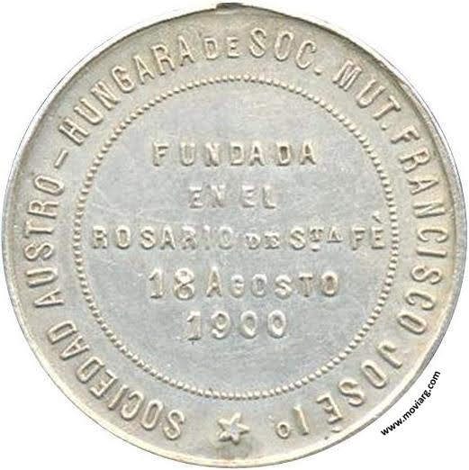 Anverso: FRANCISCO JOSÉ I° EMPERADOR DE AUSTRIA Y REY DE HUNGRIA. Firma: M. VANZO Reverso: SOCIEDAD AUSTRO-HUNGARA DE SOC. MUT. FRANCISCO JOSE I° / FUNDADA / EN EL / ROSARIO DE STA. FÉ / 18 AGOSTO / 1900 Referencia: | |