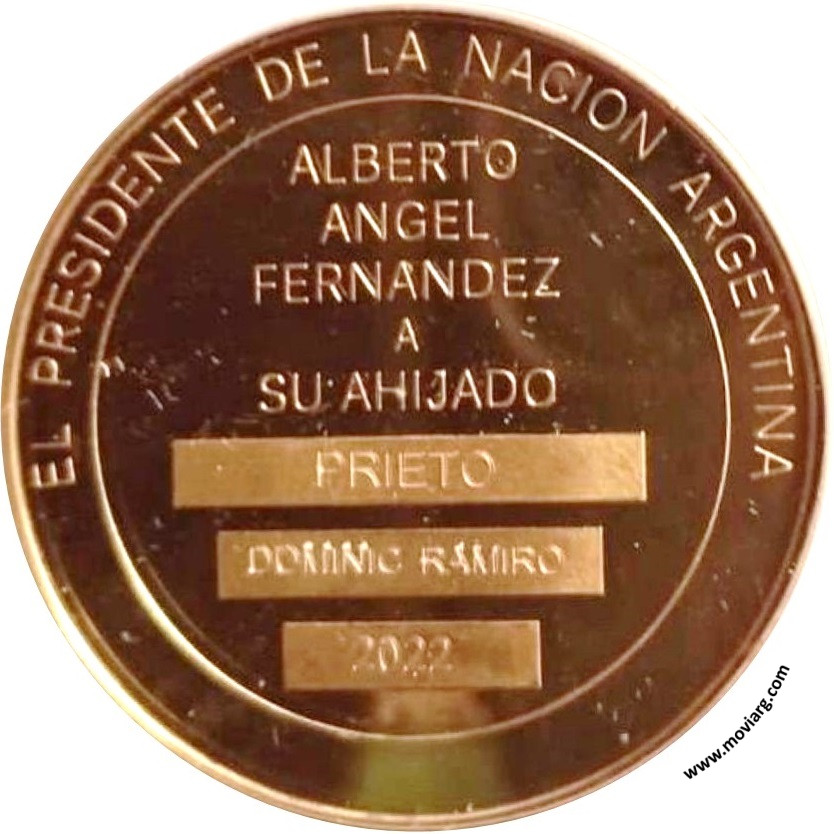 Anverso: PRESIDENCIA DE LA NACION ARGENTINA Reverso: EL PRESIDENTE DE LA NACION ARGENTINA / ALBERTO / ANGEL / FERNANDEZ / A / SU AHIJADO / [ PRIETO ] / [ DOMINIC RAMIRO ] / [ 2022 ] Referencia: | |