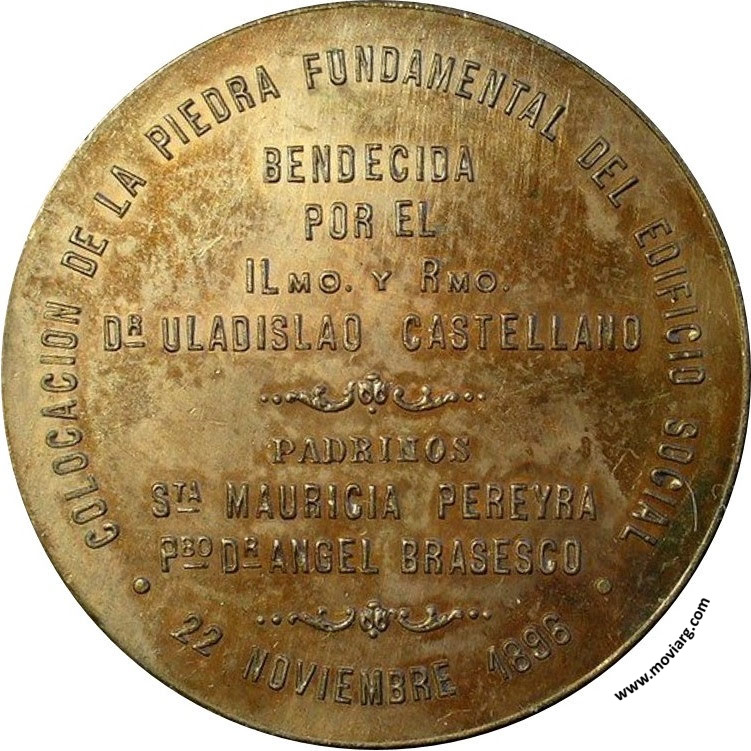 Anverso: SOCIEDAD JUVENTUD CATÓLICA / BUENOS AIRES. Firma: ORZALI Y C. Reverso: COLOCACION DE LA PIEDRA FUNDAMENTAL DEL EDIFICIO SOCIAL / 22 NOVIEMBRE 1896 / BENDECIDA / POR EL / ILMO. Y RMO. / DR. ULADISLAO CASTELLANO / PADRINOS / STA. MAURICIA PEREYRA / PBO. DR. ANGEL BRASESCO Referencia: | |
