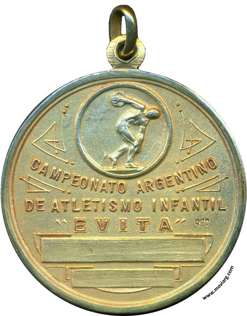 Anverso: DEPORTES / INFANTILES / EVITA Reverso: CAMPEONATO ARGENTINO / DE ATLETISMO INFANTIL / " EVITA ". Exergo: [ 900 ] Referencia: | |