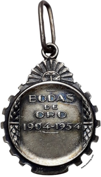 Colección MDS Anverso: AUTOMOVIL CLUB ARGENTINO / F.I.A. - A.I.T. / F.I.A.C. Firma: CASA BELLUNIReverso: BODAS / DE / ORO / 1904-1954. Exergo: [ 900 ] Canto: Nota Moviarg: F.I.A. (Fédération Internationale de l'Automobile), A.I.T. (International Touring Alliance) y F.I.A.C. (Federación Interamericana de Automóvil Clubs). Referencia: | |