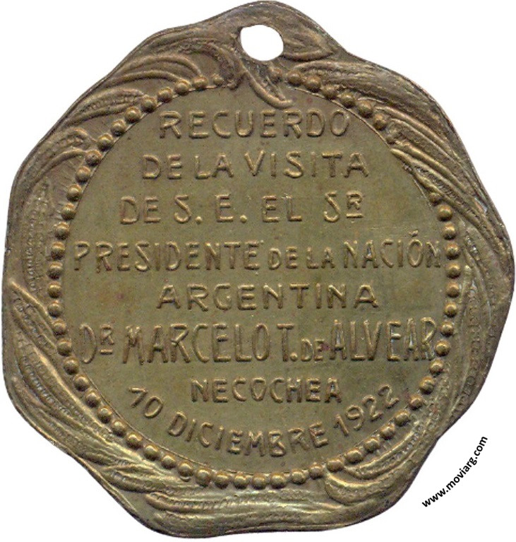Anverso: Reverso: RECUERDO / DE LA VISITA / DE S.E. EL SR. / PRESIDENTE DE LA NACIÓN / ARGENTINA / DR. MARCELO T. DE ALVEAR / NECOCHEA / 10 DICIEMBRE 1922 Referencia: | |