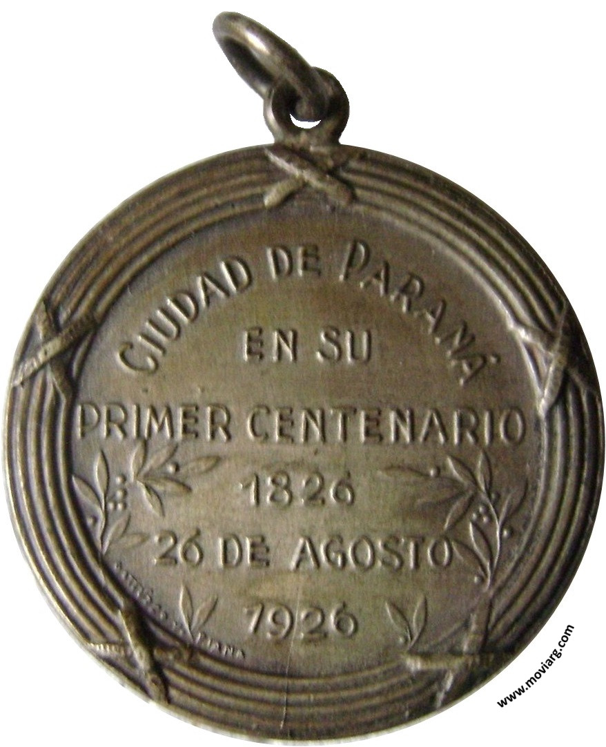 Anverso: Reverso: CIUDAD DE PARANÁ / EN SU / PRIMER CENTENARIO / 1826 / 26 DE AGOSTO / 1926. Firma: GOTTUZZO Y PIANA Referencia: | |