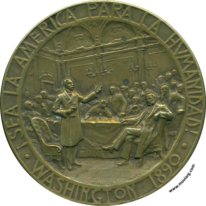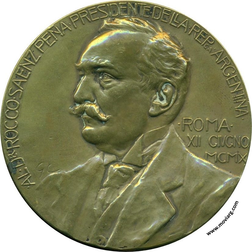 Anverso: AL DR. ROCCO SAENZ PEÑA PRESIDENTE DELLA REPCA. ARGENTINA / ROMA / XII GIUGNO / MCMX. Firma: G. C. Reverso: ¡ SEA LA AMERICA PARA LA HUMANIDAD ! / WASHINGTON 1890. Firma: M. NELLI E C. FIRENZE Referencia: | |