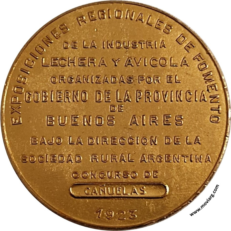 Anverso: Firma: F. COSTA Reverso: EXPOSICIONES REGIONALES DE FOMENTO / DE LA INDUSTRIA / LECHERA Y AVICOLA / ORGANIZADAS POR EL / GOBIERNO DE LA PROVINCIA / DE / BUENOS AIRES / BAJO LA DIRECCION DE LA / SOCIEDAD RURAL ARGENTINA / CONCURSO DE / CAÑUELAS / 1923 Canto: Liso. BRONCE Referencia: | |