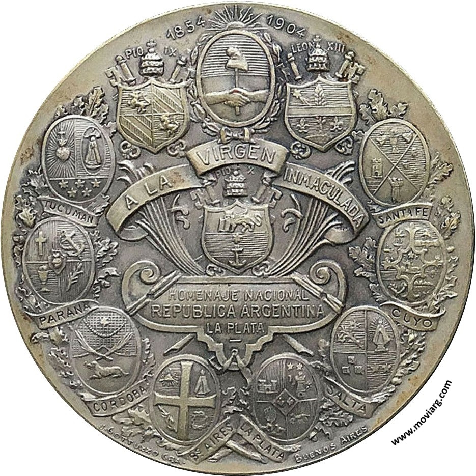 Anverso: Reverso: PIO / 1854 / 1904 / LEON XIII / HOMENAJE NACIONAL / REPUBLICA ARGENTINA / LA PLATA. Campo: CORDOBA / PARANA / TUCUMAN / SANTA FE / CUYO / SALTA / BS. AIRES / LA PLATA. Firma: J. GOTTUZZO GRA. / BUENOS AIRES Referencia: | |