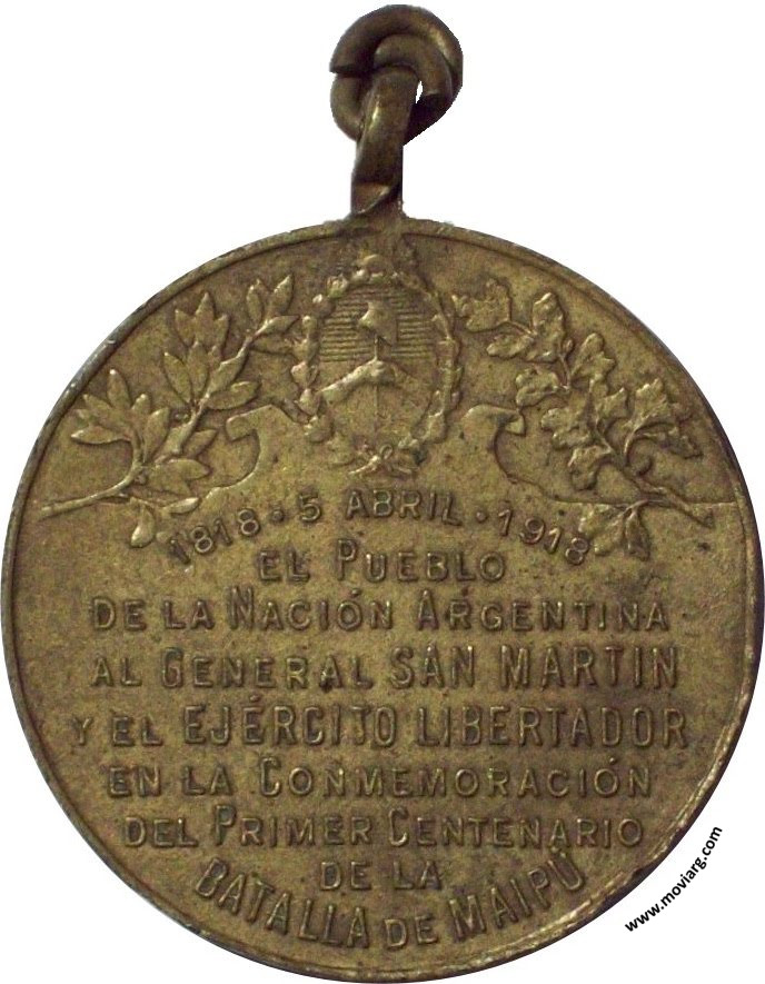 Anverso: Firma: CONSTANTE ROSSI Reverso: 1818 · 5 ABRIL · 1918 / EL PUEBLO / DE LA NACIÓN ARGENTINA / AL GENERAL SAN MARTIN / Y EL EJÉRCITO LIBERTADOR / EN LA CONMEMORACIÓN / DEL PRIMER CENTENARIO / DE LA / BATALLA DE MAIPÚ Referencia: | |