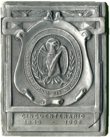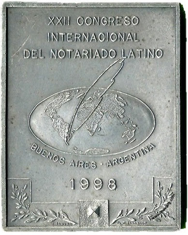 Anverso: UNION INTERNACIONAL DEL NOTARIADO LATINO / CINCUENTENARIO / 1948 - 1998 Reverso: XXII CONGRESO / INTERNACIONAL / DEL NOTARIADO LATINO / BUENOS AIRES · ARGENTINA / 1998. Firma: (???) SUAREZ (???) Referencia: | |