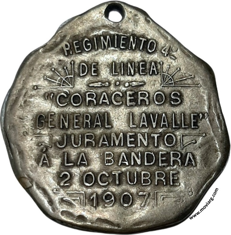 Anverso: Firma: BELLAGAMBA / Y ROSSI Reverso: REGIMIENTO 4° / DE LINEA / " CORACEROS / GENERAL LAVALLE " / JURAMENTO / Á LA BANDERA / 2 OCTUBRE / 1907. Campo: [ 8 (800?) ] Referencia: | |