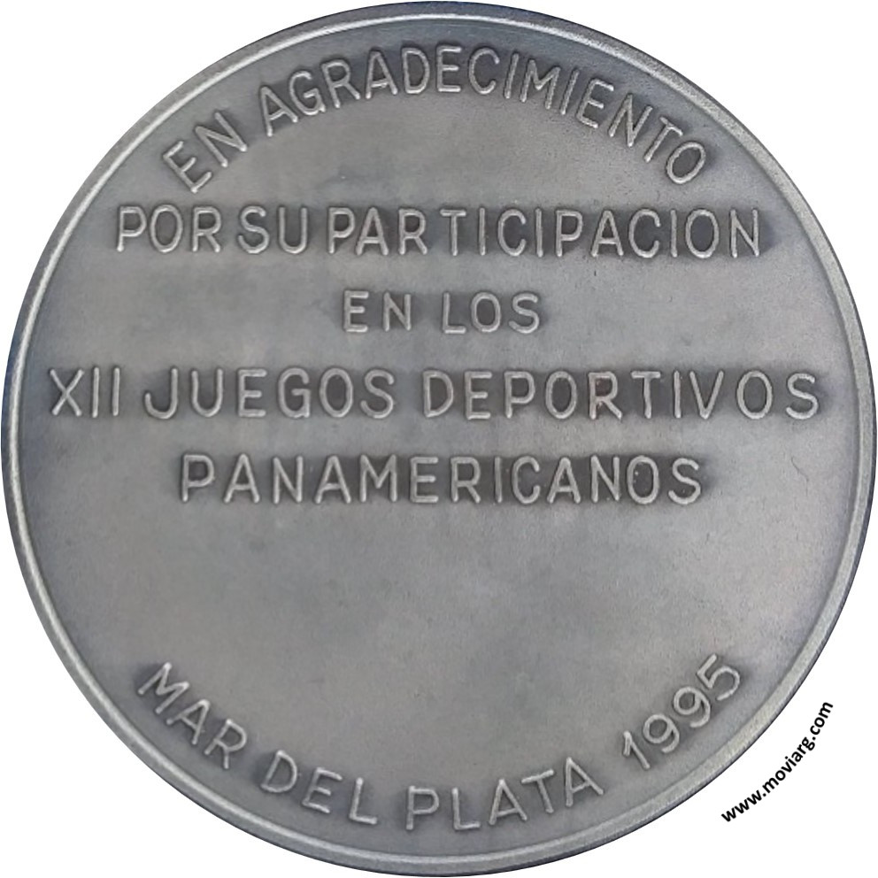 Anverso: SECRETARIA DE DEPORTES / PRESIDENCIA DE LA NACION / ARGENTINA Reverso: EN AGRADECIMIENTO / POR SU PARTICIPACION / EN LOS / XII JUEGOS DEPORTIVOS / PANAMERICANOS / MAR DEL PLATA 1995 Referencia: | |