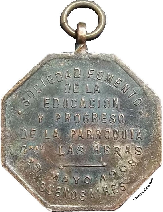 Anverso: Firma: BELLAGAMBA Y ROSSI Reverso: SOCIEDAD FOMENTO / DE LA / EDUCACION / Y PROGRESO / DE LA PARROQUIA / GRAL. LAS HERAS / 23 MAYO 1908 / BUENOS AIRES Referencia: | |