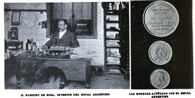 Don Faustino (sic) de Rosa, Industrial establecido desde hace largos años en Buenos Aires, es autor de un nuevo metal, obtenido por aleación de cobre, niquel, zinc y plata, a la que se incorporan además ciertas sales que dan homogeneidad a la liga y contribuyen a blanquearlo. El inventor ha obtenido su patente respectiva y ha exhibido diversas muestras de ese metal en varias formas, habiéndose fabricado con el medallas o monedas en el establecimiento de los señores Bellagamba y Rossi, y últimamente en la misma Casa de Moneda. El inventor ha dado a su liga el nombre de metal argentino por amor al suelo hospitalario en que ha formado su hogar y su fortuna. El metal argentino es blanco y homogéneo, exterior e interiormente. Inalterable, de resistencia superior a la de los otros metales, ofrece garantías contra la falsificación. Una moneda falsa tendría que ser mayor de tamaño para tener el mismo peso de la legítima; si el tamaño fuera igual, su peso sería inferior.