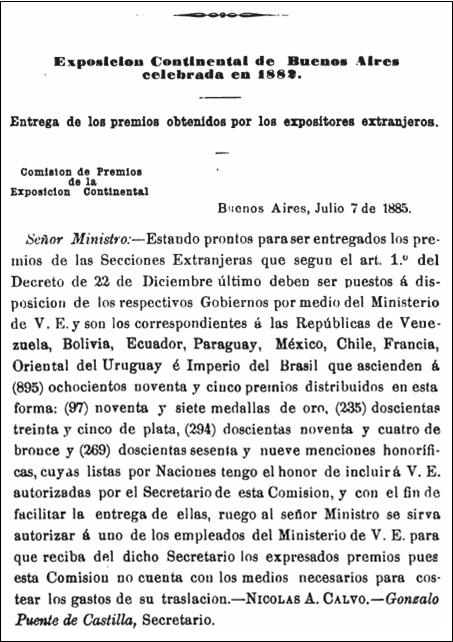 Según lo publicado en el Boletín Mensual se han repartido 97 medallas de oro, 235 de plata, 294 de bronce y 269 menciones en bronce entre los participantes extranjeros. Por otro lado se sabe que han concurrido 2.000 expositores nacionales y 1.200 extranjeros, por lo cual es posible asumir que el número de medallas entregadas en forma local habrá sido similar a la de las extranjeras. Además ha sido enviado a cada delegado de estos países un paquete conteniendo una de cada una de las medallas en concepto de regalo según las cartas firmadas por Francisco J. Ortiz a las delegaciones en el mismo boletín mensual.