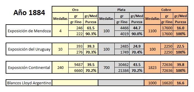 Es posible notar que las primeras piezas, para la Exposición de Mendoza, la pureza de las piezas llega al 90%, como pide la ley para la acuñación monetaria, pero rápidamente disminuye con las siguientes piezas al 70% para las de Oro y Plata.