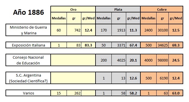 Para las piezas del año 1886 se pierde noción del fino involucrado por pieza, si bien está detallado el total, se desconoce el fino por tipo de medalla dado que menciona para cada material ademas de las medallas la fabricación de láminas, lo cual imposibilita la tarea de poder calcular la ley de las medallas acuñadas.