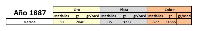Lamentablemente para el año 1887 se pierde la información que detalla a la acuñación de medallas muy probablemente por la alta acuñación que tuvo este año en Argentinos de Oro.