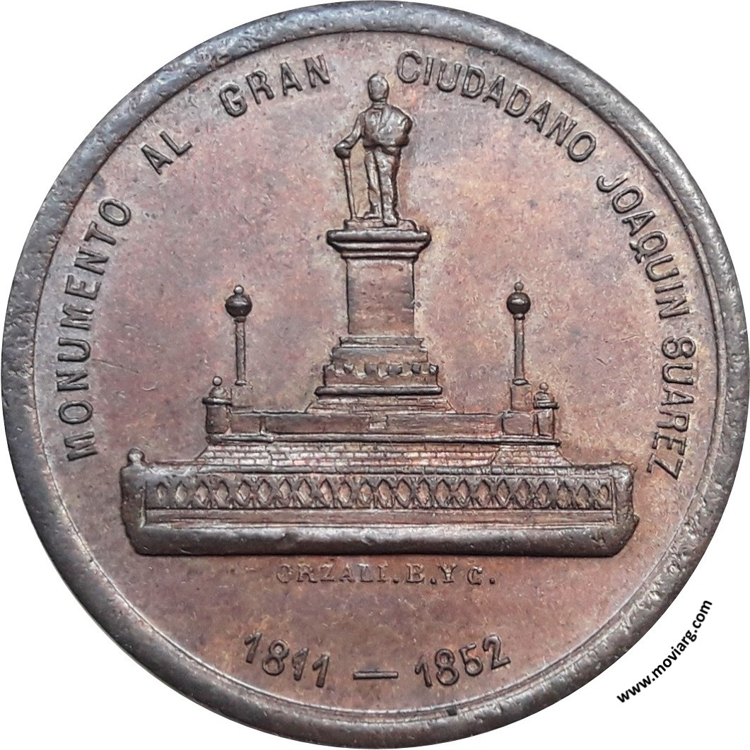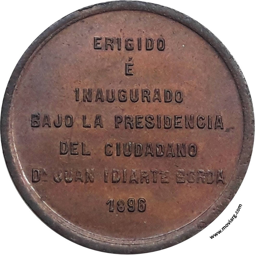 Anverso: MONUMENTO AL GRAN CIUDADANO JOAQUIN SUAREZ / 1811 - 1852. Firma: ORZALI B. Y C. Reverso: ERIGIDO / É / INAUGURADO / BAJO LA PRESIDENCIA / DEL CIUDADANO / DN. JUAN IDIARTE BORDA / 1896 Referencia: | |