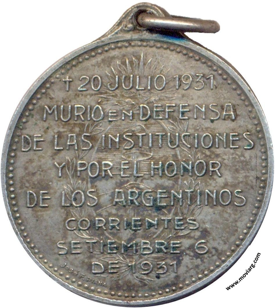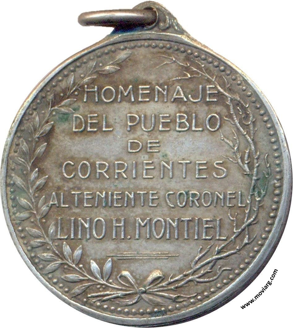 Anverso: HOMENAJE / DEL PUEBLO / DE / CORRIENTES / AL TENIENTE CORONEL / LINO H. MONTIEL Reverso: 20 JULIO 1931 / MURIÓ EN DEFENSA / DE LAS INSTITUCIONES / Y POR EL HONOR / DE LOS ARGENTINOS / CORRIENTES / SETIEMBRE 6 / DE 1931. Firma: JOSÉ F. PIANA Referencia: | |