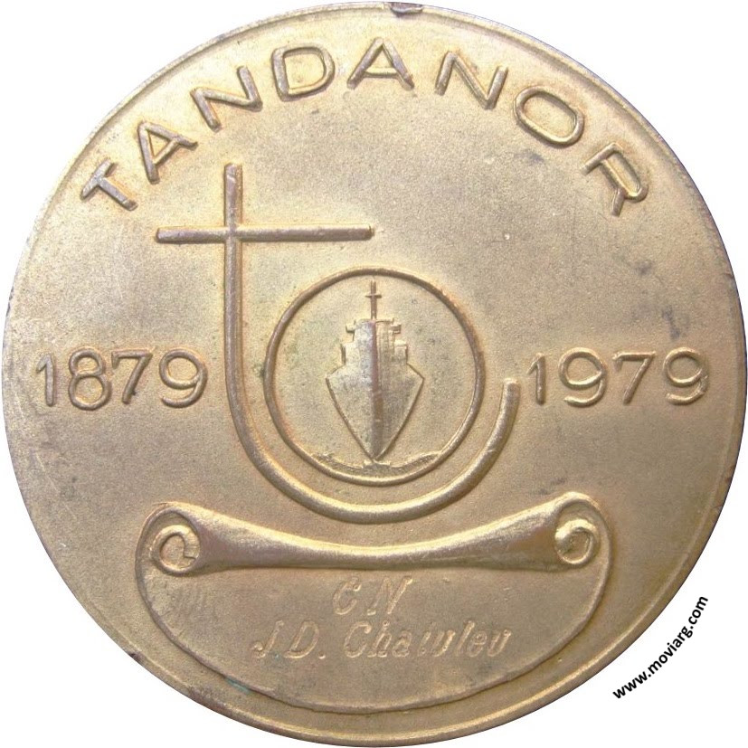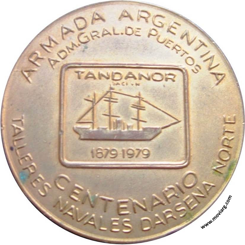 Anverso: TANDANOR / 1879 / 1979 / [ C N ] / [ J. D. CHALULEU ] Reverso: ARMADA ARGENTINA / ADM. GRAL. DE PUERTOS / CENTENARIO / TALLERES NAVALES DARSENA NORTE. Campo: TANDANOR / S.A.C.I. Y N. / 1879-1979 Referencia: | |