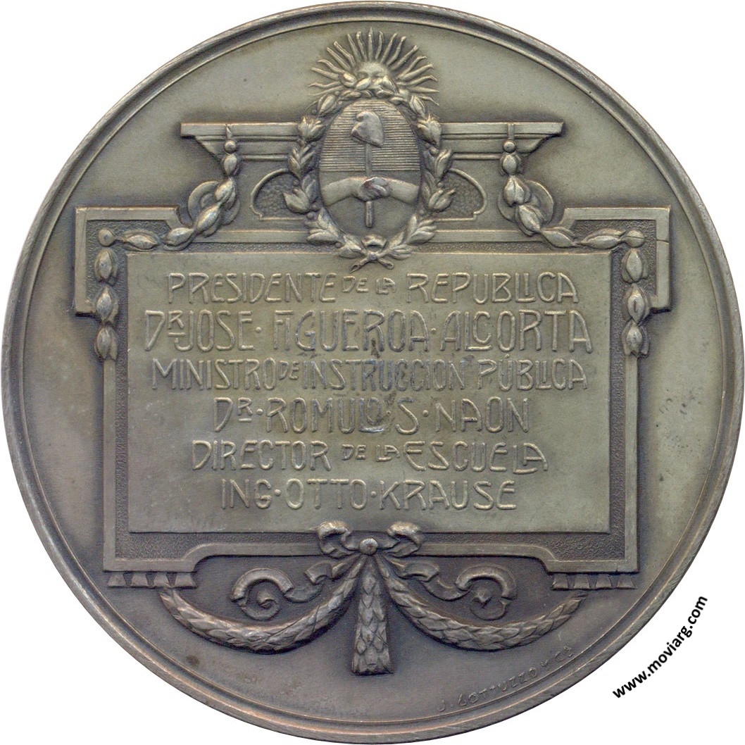 Anverso: ESCUELA INDUSTRIAL DE LA NACION / INAUGURADA EL 24 DE MAYO 1909. Firma: E. MUELLER Reverso: PRESIDENTE DE LA REPUBLICA / DR. JOSE FIGUEROA ALCORTA / MINISTRO DE INSTRUCCION PÚBLICA / DR. ROMULO S NAON / DIRECTOR DE LA ESCUELA / ING. OTTO KRAUSE. Firma: J. GOTTUZZO Y CA. Referencia: | |