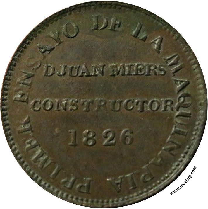 Anverso: LA CASA DE MONEDA / DE BUENOS AIRES Reverso: PRIMER ENSAYO DE LA MAQUINARIA / D. JUAN MIERS / CONSTRUCTOR / 1826 Referencia: BURZIO-5353 ROSA-/55 | |