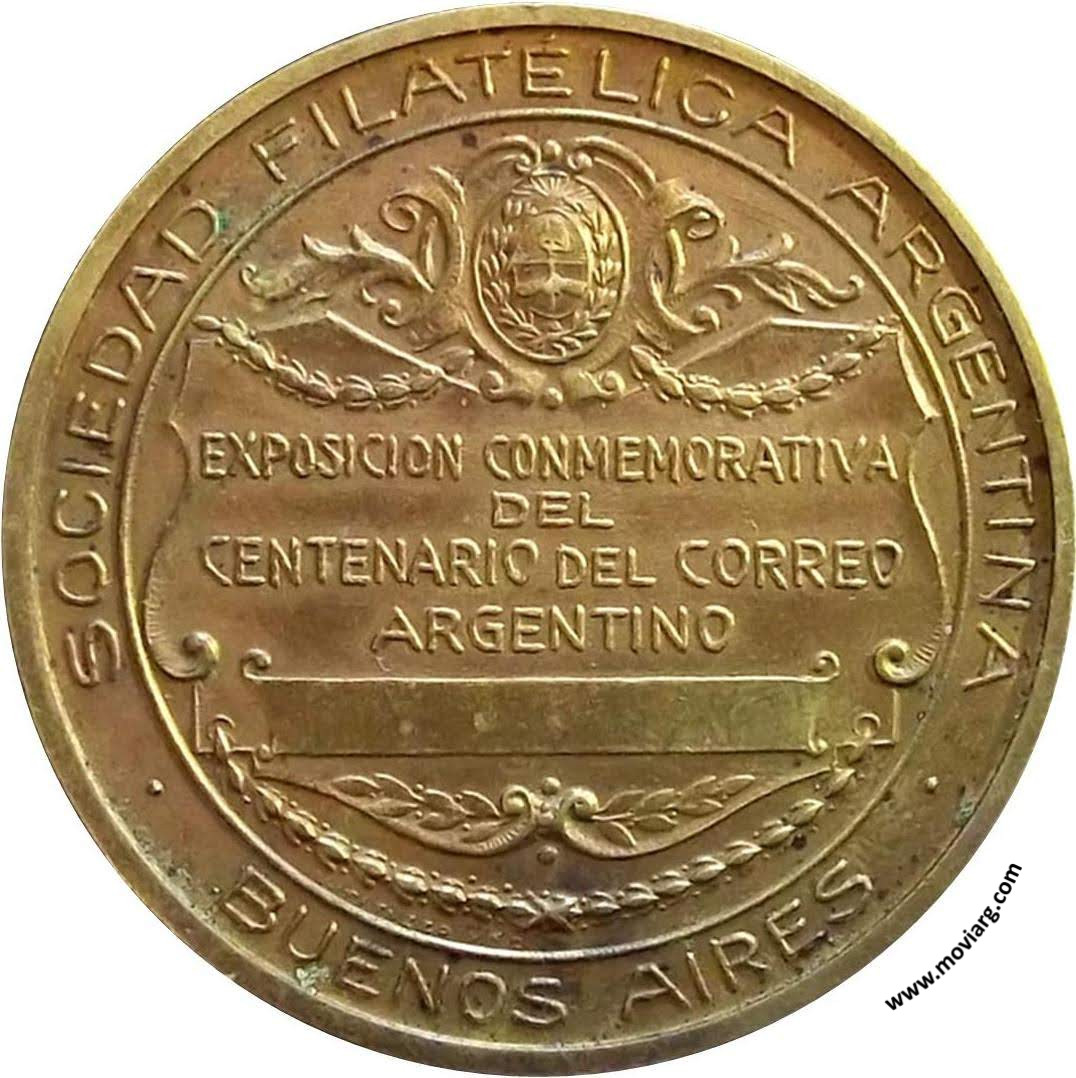 Anverso: REPÚBLICA ARGENTINA / 1826 / 1926 / VII EXPOSICION Reverso: SOCIEDAD FILATÉLICA ARGENTINA / BUENOS AIRES / EXPOSICION CONMEMORATIVA / DEL / CENTENARIO DEL CORREO / ARGENTINO. Firma: GOTTUZZO Y CA. Referencia: | |