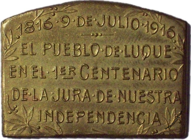 Anverso: Firma: GOTTUZZO Y CA. Reverso: 1816 · 9 DE JULIO · 1916 / EL PUEBLO DE LUQUE / EN EL 1ER. CENTENARIO / DE LA JURA DE NUESTRA / INDEPENDENCIA Referencia: | |