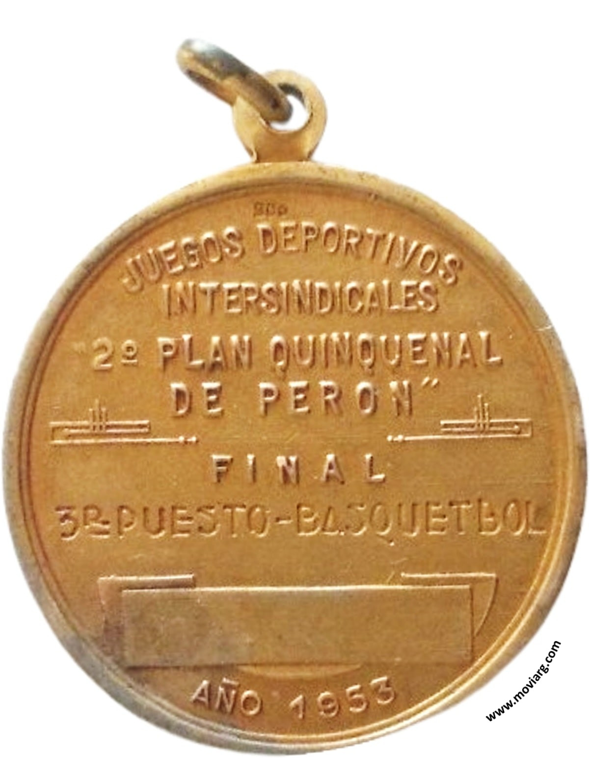 Anverso: MINISTERIO DE SALUD PUBLICA / PROVINCIA DE BUENOS AIRES / C.G.T. (Confederación General del Trabajo) Reverso: JUEGOS DEPORTIVOS / INTERSINDICALES / " 2° PLAN QUINQUENAL / DE PERON " / FINAL / [ 3R. PUESTO - BASQUETBOL ] / AÑO 1953. Exergo: [ 900 ] Referencia: | |