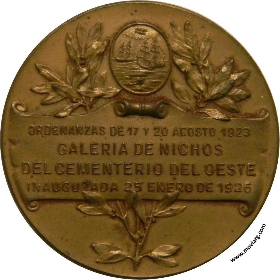 Anverso: MUNICIPALIDAD DE BUENOS AIRES, Firma: D. VITTORIA Reverso: ORDENANZAS DE 17 Y 20 AGOSTO 1923 / GALERIA DE NICHOS / DEL CEMENTERIO DEL OESTE / INAUGURADA 25 ENERO DE 1926 Canto: Liso Referencia: | |
