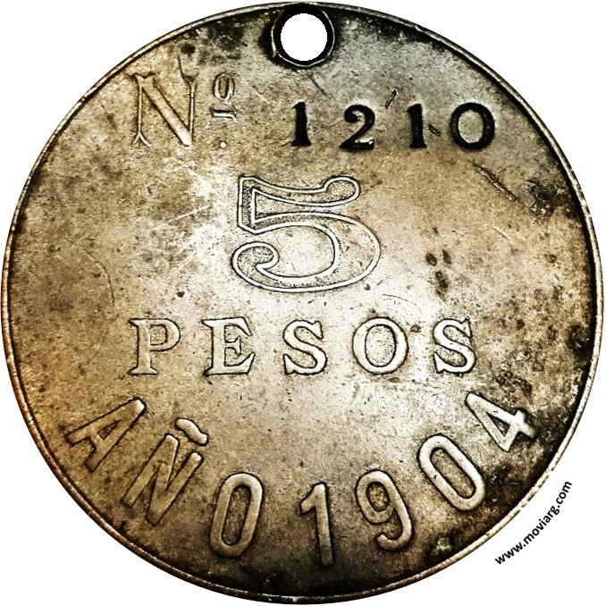 Anverso: N° [ 1210 ] / 5 / PESOS / AÑO 1904 Reverso: PATENTE DE AMBULANTE Canto: Estriado Recto Referencia: | |