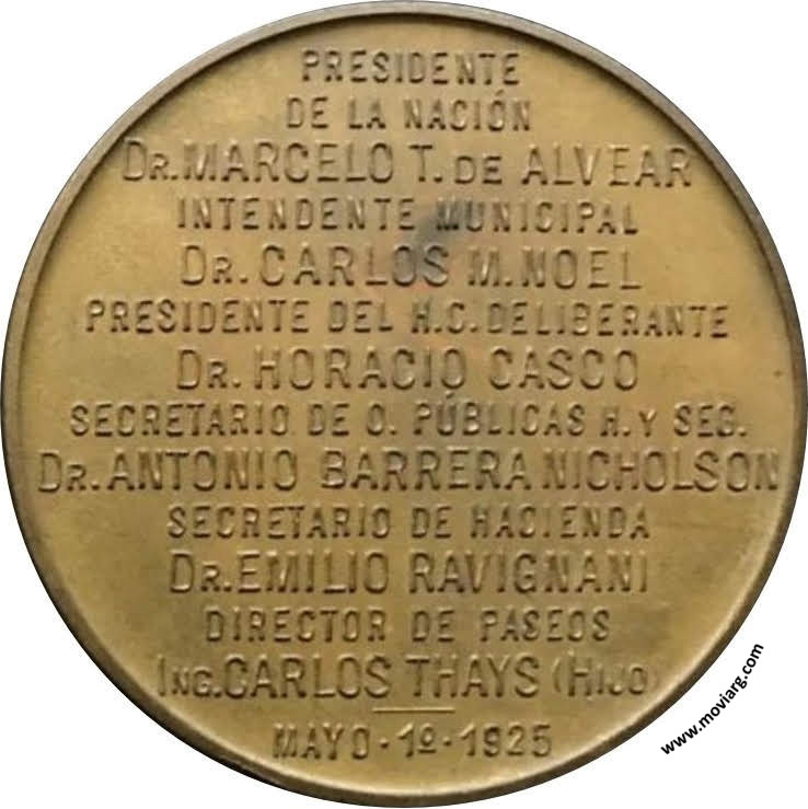 Anverso: MUNICIPALIDAD DE BUENOS AIRES " PLAZA 1° DE MAYO ". Firma: CONSTANTE ROSSI Reverso: PRESIDENTE / DE LA NACIÓN / DR. MARCELO T. DE ALVEAR / INTENDENTE MUNICIPAL / DR. CARLOS M. NOEL / PRESIDENTE DEL H. C. DELIBERANTE / DR. HORACIO CASCO / SECRETARIO DE O. PÚBLICA H. Y SEG. / DR. ANTONIO BARRERA NICHOLSON / SECRETARIO DE HACIENDA / DR. EMILIO RAVIGNANI / DIRECTOR DE PASEOS / ING. CARLOS THAYS ( HIJO ) / MAYO 1° 1925 Referencia: | |