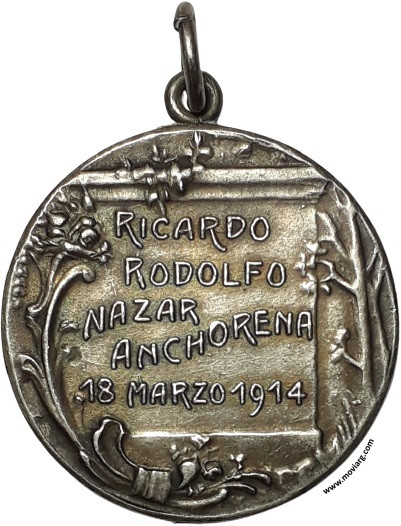 Anverso: Reverso: RICARDO / RODOLFO / NAZAR / ANCHORENA / 18 MARZO 1914 Canto: Liso. PLATA Referencia: | |