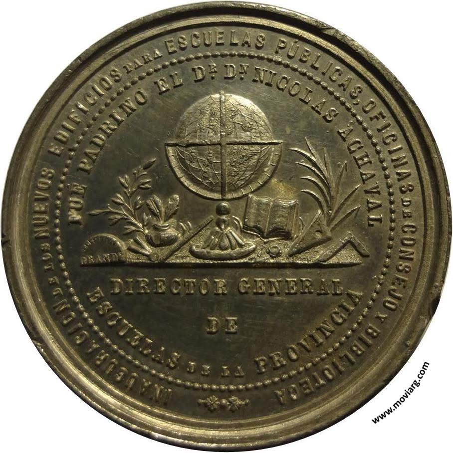Anverso: INAUGURACION DE LOS NUEVOS EDIFICIOS PARA ESCUELAS PÚBLICAS, OFICINAS DE CONSEJO Y BIBLIOTECA / FUÉ PADRINO EL DR. DN. NICOLAS ACHAVAL / DIRECTOR GENERAL / DE / ESCUELAS DE LA PROVINCIA. Firma: GRANDE Reverso: CONSEJO ESCOLAR / PRESIDENTE / DR. DN. TORCUATO B. ZUBIRIA / INSPECTORES / DR. DN. PEDRO P. BELDERRAIN / DN. EDUARDO ACEVEDO DIAZ / TESORERO / DN. JUAN B. PARETO / VOCAL / DR. DN. DALMIRO ALSINA / SECRETARIO / DN. GREGORIO M. GONZALEZ / ABRIL 1884 DOLORES. Referencia: ROSA-315 FERRARI-99 (RG) | |
