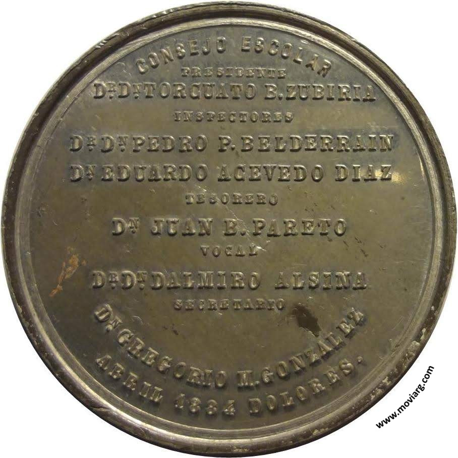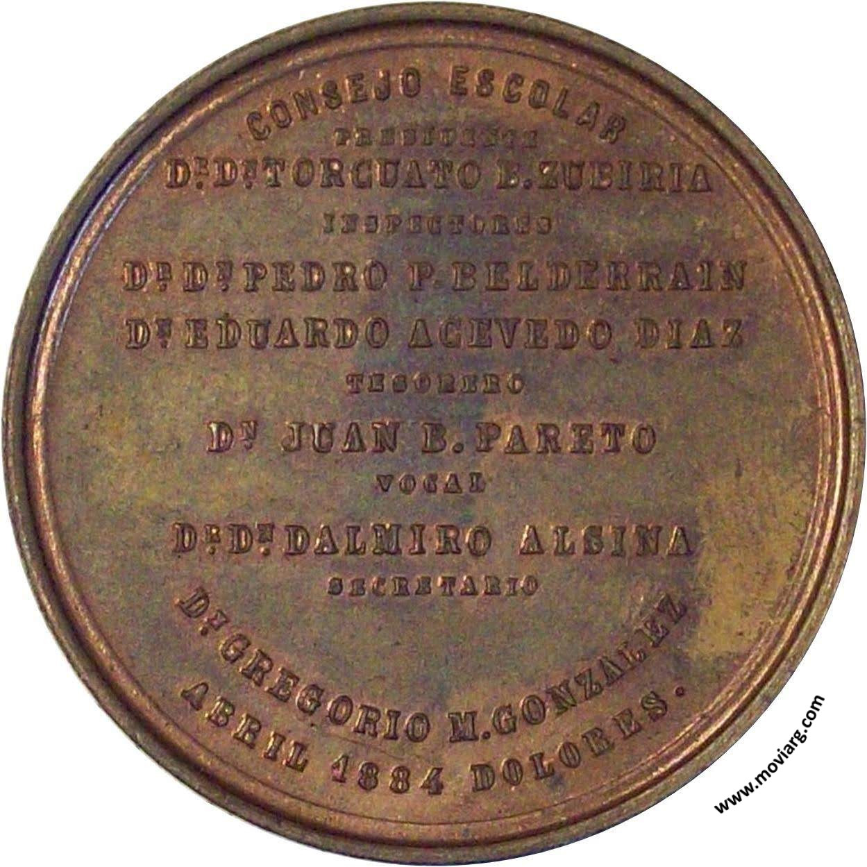 Anverso: INAUGURACION DE LOS NUEVOS EDIFICIOS PARA ESCUELAS PÚBLICAS, OFICINAS DE CONSEJO Y BIBLIOTECA / FUÉ PADRINO EL DR. DN. NICOLAS ACHAVAL / DIRECTOR GENERAL / DE / ESCUELAS DE LA PROVINCIA. Firma: GRANDE Reverso: CONSEJO ESCOLAR / PRESIDENTE / DR. DN. TORCUATO B. ZUBIRIA / INSPECTORES / DR. DN. PEDRO P. BELDERRAIN / DN. EDUARDO ACEVEDO DIAZ / TESORERO / DN. JUAN B. PARETO / VOCAL / DR. DN. DALMIRO ALSINA / SECRETARIO / DN. GREGORIO M. GONZALEZ / ABRIL 1884 DOLORES. Referencia: ROSA-315/91 FERRARI-99 (RG) | |