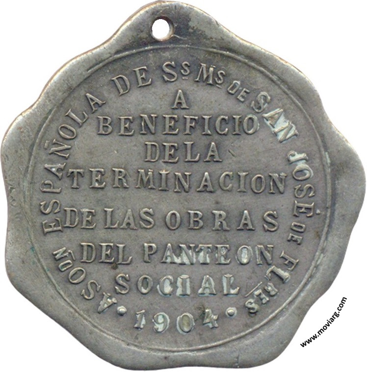 Anverso: Reverso: ASOON. ESPAÑOLA DE SS. MM. DE SAN JOSÉ DE FLRES. / A / BENEFICIO / DE LA / TERMINACION / DE LAS OBRAS / DEL PANTEON / SOCIAL Referencia: | |