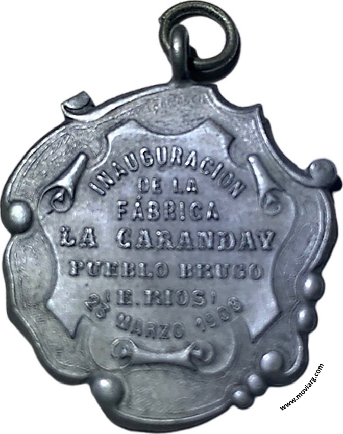 Colección Magnin Anverso: LA CARANDAY. Firma: BELLAGAMBA Y ROSSIReverso: INAUGURACION / DE LA / FÁBRICA / LA CARANDAY / PUEBLO BRUGO / ( E. RIOS ) / 23 MARZO 1908 Referencia: | |