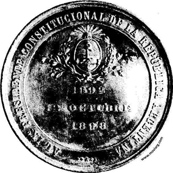 | Año: 1892 Política y Gobierno Metal: Peltre - Peso: 93gr - Módulo: 59mm Grabador: Podestá y Hno. | |